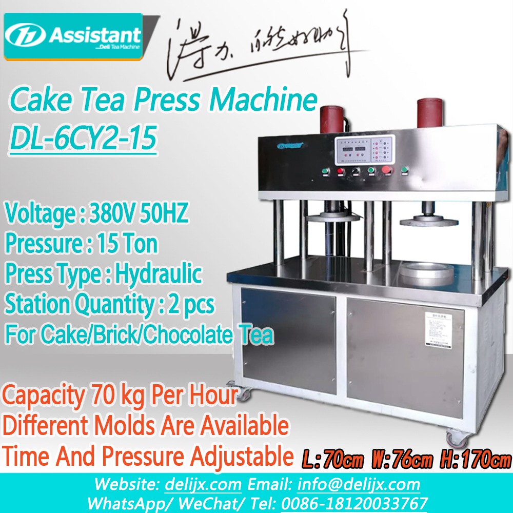 DL-6CY2-15 mainly used for pressing cake tea, brick tea, chocolate type tea, the pressure and time can be adjusted, using hydraulic control, tea shaping is better. Machine has 2 working stations, 2 workers can operate the machine at the same time, 1 hour can press 70kg cake tea (357gram).