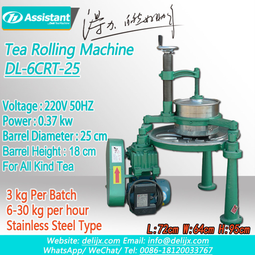 DL-6CRT-25 tea rolling machine drum diameter is 25cm, height 18cm, can put about 3kg per batch, for green tea processing, capacity is 3-30kg per hour, for black tea processing, capacity is 3-6 kg per hour.